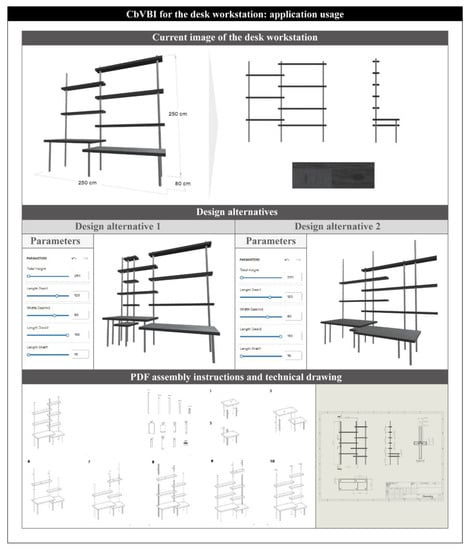 Design alternative 1 includes the following values: TH = 250, LD1 = 120, WD1&2 = 80, LD2 = 150 and LS = 10. On the other hand, design alternative 2 is shaped by the values: 300, 200, 100, 150 and 50. Finally, according to the CbVBI methodology, a PDF manual with all the appropriate instructions for the furniture assembly is produced. The current manual is similar and looks like the instruction books found in IKEATM DIY products.