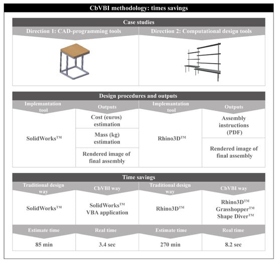 Finally, it is important to note the time saved with the use of the CbVBI methodology in comparison with traditional design procedures. More specifically, Figure 13 presents the final times of the two aforementioned case studies: (a) CAD-based design and assembly of a DIY coffee table and (b) graphical algorithmic design and assembly of a DIY desk workstation. More specifically, the time needed for the development of a coffee table design (first case study) using a traditional design method, SolidworksTM, is estimated to be about 85 min (including design and rendering procedures). On the other hand, the time needed for the development of the same coffee table via the use of CbVBI methodology was demonstrated to be 3.4 s. It is important to note that this time is relative to a computer’s sensitivity. The second case study involved the development of a workstation design. The time that a designer needs to develop a CAD model of a workstation with all design and assembly instructions via RhinoTM is estimated at about 270 min. The CbVBI methodology is capable of generating the same files (i.e., the CAD model and assembly instructions) in 8.2 s.