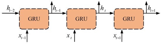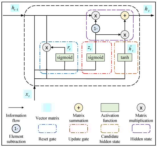 The internal structure of a GRU is shown in Figure 2 [27]. The reset gate and the update gate in the GRU are the input of the current time step and the hidden state of the previous time step, which are calculated by the sigmoid activation function in the fully connected layer. The formulas are as follows: