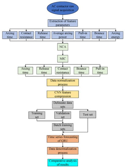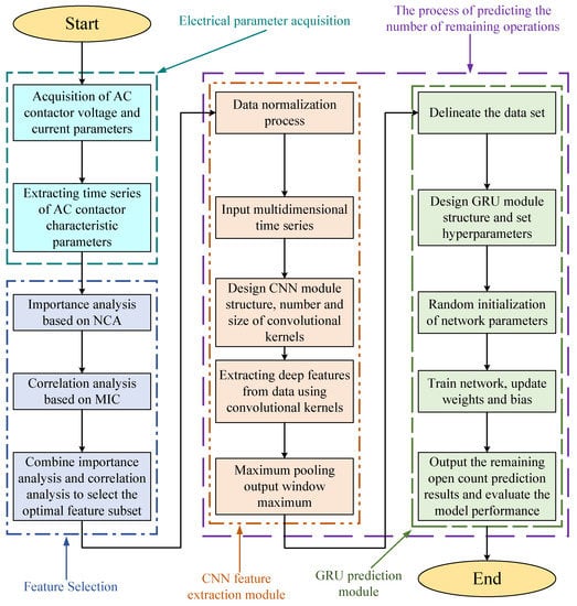 Firstly, the AC contactor full-life test platform is built, and the voltage and current signals during operation are collected using high-precision sensors to extract the feature parameters which reflect the degradation state of the AC contactor. Then, NCA is used to calculate the importance of the feature parameters to the residual-electrical-endurance, and the optimal feature subset is obtained by removing the invalid and redundant feature parameters to the residual-electrical-endurance prediction with the correlation degree of the feature parameters, which are calculated by MIC. After that, the optimal feature subset is subjected to dimensionless normalization. The processed multidimensional time series are input into the CNN, and the feature vectors are extracted by setting the CNN model structure, and the number and size of convolutional kernels. Mining the regular information between features by using the depth of convolutional computation, and compressing the feature dimension by using the maximum pooling operation, can retain the feature information and further reduce the complexity of computation. Finally, the extracted feature vectors are extended and input into the GRU, and the remaining number of operations of AC contactors is used as the prediction label to set the window length and divide the data set. The GRU neural network is trained by setting the GRU model structure and hyperparameters, initializing the network parameters, and continuously updating the weights and biases. The GRU fully considers the correlation before and after the AC contactor life cycle and captures the sequence long-time step dependence while taking account of the correlation and nonlinear relationship of the time-series data, which can efficiently remember the long-time history feature information and output them through the fully connected layer. The predicted values are back-normalized to obtain the results of the predicted remaining number of operations, and the predicted results are evaluated and analyzed using evaluation indexes.