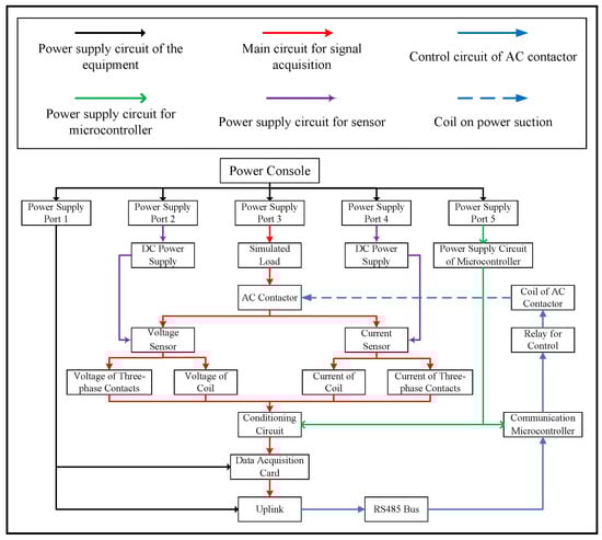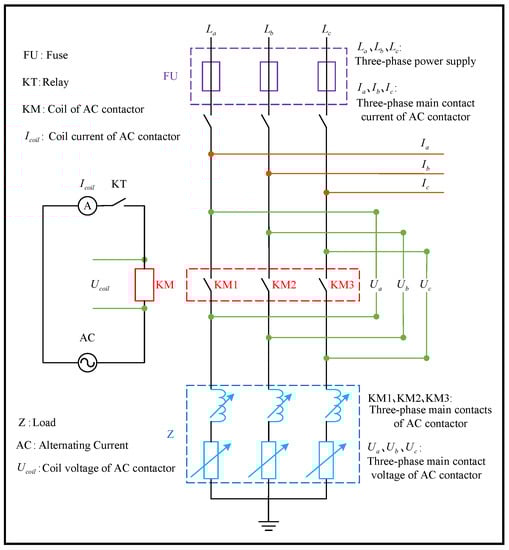 Finally, the schematic diagram of the physical principle of the AC contactor full-life test platform is shown in Figure 10.