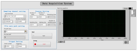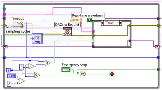 The software programming combines the NI data-acquisition card with LabVIEW through the communication serial port to realize the online acquisition of the running data. The LabVIEW front-end control panel is shown in Figure 7. The program diagram of the LabVIEW back-end is shown in Figure 8.