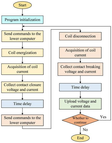 The flow chart of the software control of the test system is shown in Figure 9. After initialization, the program sends a closing command to the lower computer, and the microcontroller receives the command and outputs a high-level signal to control the relay to close, and then the contactor coil is energized to turn on the main circuit. Over a span of time, the contactor is disconnected from the main circuit by sending a break command to the lower computer. The waveform data of the test is collected, displayed and saved in real time.