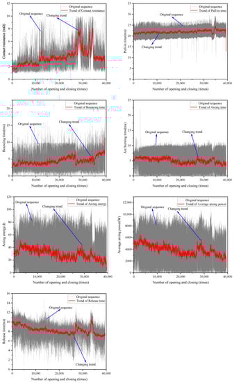 From the comparison, one can see that when the electrical life of the AC contactor is terminated, the three-phase contacts are severely ablated. The original sequences of the feature parameters of the test samples and their variation trends are shown in Figure 15.