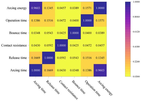 Through the NCA feature importance analysis, the mean arc power has the lowest importance for the residual-electrical-endurance, and should be eliminated. After that, the correlation coefficients among the remaining six feature parameters were calculated using MIC, and the correlation coefficient heat map is shown in Figure 17.