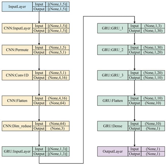 This paper is based on the CNN-GRU residual-electrical-endurance prediction model of the AC contactor. The structure of this model is shown in Figure 4.