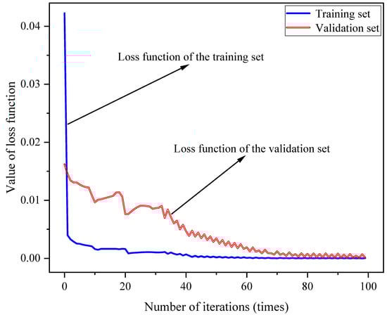 When the number of iterations was lower than 80 times, the loss-function curves of the training set and the validation set show a decreasing trend. When the number of iterations reaches 80 times, the loss-function converges completely, after which the loss function of the validation set does not show a steep rising trend and is not overfitted, so the model training effect is good.