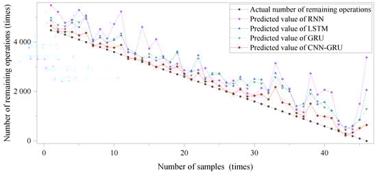 It can be clearly seen from the comparison results that the results predicted in this paper are closest to the actual values and have the highest accuracy. In summary, the residual-electrical-endurance prediction model of an AC contactor based on the CNN-GRU method has high accuracy and robustness, which can meet the practical engineering needs and has wide application prospects.