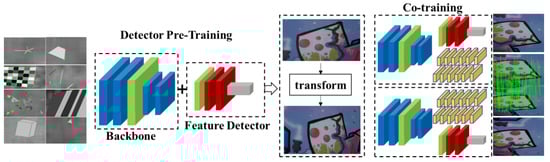 The test platform is equipped with an Intel i9-7900X CPU @ 3.30 GHz × 20, 64 GB RAM, and 2080Ti GPU hardware platform and ubuntu18.04 system for the experiments. The proposed approach was evaluated on the TUM dataset [] and HPSequences dataset []. The TUM dataset includes data of different scenes, scenes with texture, scenes without texture, near scenes, and far scenes. The HPSequences dataset contains data about illumination changes and perspective changes, which can be tested separately. We use the self-supervised learning proposed in [] to train detectors and descriptors without manual data annotation, which reduces the complexity and workload of manual annotation, as shown in Figure 1.