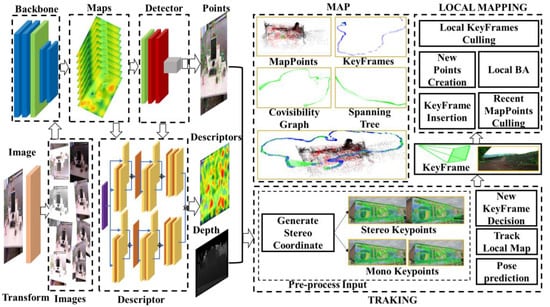 As shown in Figure 2, the input image was transformed to form an image group, and then the backbone network module was used to extract features from the image group. The extracted features are inputted into the feature detection module and the feature description module for feature detection and description, respectively, again sharing their information. This tracking module preprocesses the Siamese feature points, descriptors, and depth picture, generating coordinates for pose prediction, local map tracking, and determining new keyframes. The local mapping module is used to insert and delete new keyframes, create and delete new points, and perform local BA operations. The map module includes map points, keyframes, a visibility graph, and a spanning tree.