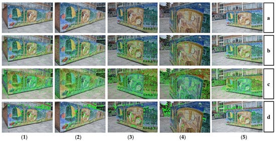 The proposed method (Figure 5b) compares feature point extraction with the state-of-the-art deep learning method Superpoint [] (Figure 5c) and the traditional method ORB (Figure 5d). We detected feature points from five perspectives in the same scene, and the green points represent the detected feature points, as shown in Figure 5. The proposed method has a more uniform feature point distribution and detection rate than the traditional methods. Although the feature points detected by Superpoint are relatively dense, the experimental results show that the detected feature points are not stable, which can be proven in the following matching experiment.