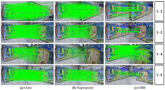 As shown in Figure 6, we implemented matching experiments on cross-view scenes, and the green lines represent matches of the corresponding feature points. As you can see from above, our method has more dense and correct feature point matching when compared with Superpoint and ORB features at five different perspectives. Especially in the large viewing angle scenes in Figure 6(1–3) and Figure 6(1–4), both Superpoint and ORB have several mismatched samples.