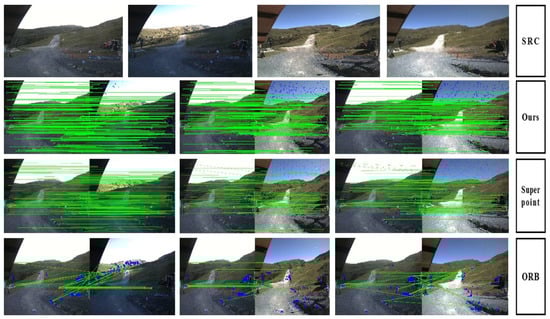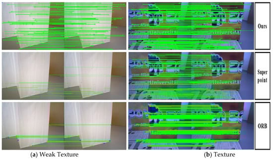 We also implemented comparative experiments on weak and rich textures, as shown in Figure 8. For rich texture, all three methods seem to give good results on feature detection and matching. However, the ORB and Superpoint performed poorly with weak textures due to their high dependence on texture, corners, and edges. In contrast, our proposed method is less dependent on them, so it still shows a state-of-the-art performance on both detection and matching.