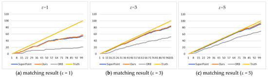 To further illustrate the impact of correct matching and successful matching on the SLAM system, as shown in Figure 9, we also count the success of our proposed method in 100 images in 20 different scenes with different perspectives, different illumination datasets, etc. The match performance is compared with the excellent deep learning method SuperPoint and the traditional method ORB. As shown in the figure, the abscissa is the number of images, and the ordinate is the number of images successfully matched. The yellow line is the actual ground truth, the orange line is the matching result of our proposed method, the blue is the SuperPoint algorithm, and the gray is the ORB algorithm. Figure 9a shows the matching result when the error ε = 1, Figure 9b shows the matching result when the error ε = 3, and Figure 9c shows the matching result when the error ε=3. It can be seen from the results in these figures that our proposed method achieves excellent successful matching results whether it is ε = 1, ε = 3, or ε = 5.
