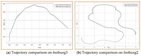 In this part, we conducted a comparative experiment on ORB-SLAM2 [] but not on ORB-SLAM3 [] because ORB-SLAM2 and ORB-SLAM3 are the same in this part, but a fragmented submap module is added. The function of this module is to lose track. At the same time, the submap is stored first for subsequent map splicing.