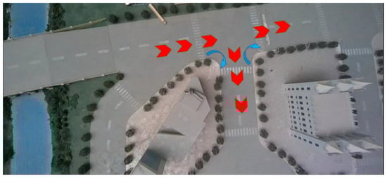 Top view of the running path. The red arrows indicate the traveling direction of the car, and the blue arrows indicate the turning direction of the car.