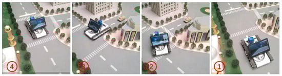 Illustration of the car in different locations. Images (1), (2), (3), and (4) show the position of the car at different moments, respectively.