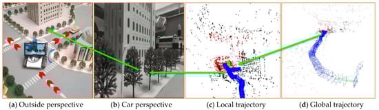 Figure 11 shows the driving route (red arrow) of the car, and Figure 12 shows the position status of the car, according to the driving route. Figure 13a, represents the external view of the car in the experimental scene, where the red arrow is the driving route of the car and the blue arrow is the turning direction of the car. Figure 13b represents the view of the unmanned vehicle when the car is turning. Figure 13c represents the magnified view of the local position of the car at the current time, where the red point in the figure represents the current landmark point seen by the car; the black point is the landmark point seen by the car from a historical perspective, the blue box represents the historical position of the car, and the green box represents the current position of the car. Figure 13d represents the global positioning and mapping of the car, and the green line is the driving trajectory of the car. The positions indicated by the green arrows are the positions of the same position in different views.