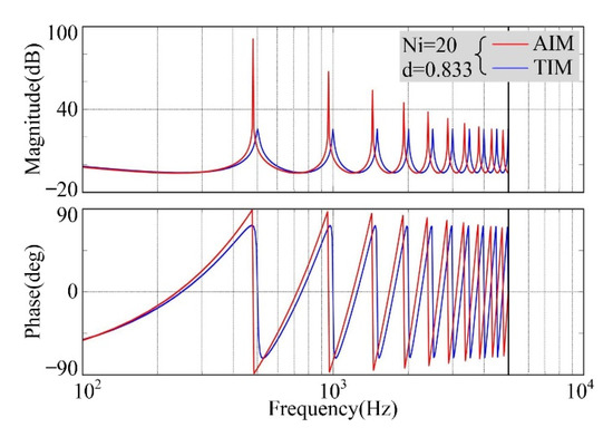 The 6th harmonics frequency is 480 Hz while the BLDC motor is operated at 1200 rpm, thus, the real sampling number N is 20.833, the integer part Ni is 20 and the fractional part d is 0.833. In this case, the first corresponding resonant frequency of TIM is close to 500 Hz, as shown in Figure 3. It is also shown in Figure 3 that the frequency offset is 20 Hz when compared to the target frequency. On the other hand, the first corresponding resonant frequency of AIM is 480 Hz. Thus, AIM can supply better frequency tracking performance for the RC controller in comparison with TIM. Additionally, the open-loop gain of AIM is larger than the open-loop gain of TIM, which can supply better harmonic suppression ability.