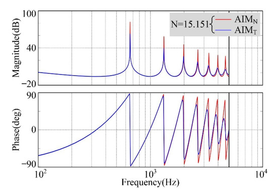The 6th harmonics frequency is 660 Hz and the real sampling number N is 15.151, while the BLDC motor is operated at 1650 rpm. According to the traditional decomposition rule, the sampling number N can be decomposed into integer parts Ni and fractional parts d, and the values of Ni and d are 15 and 0.151, respectively. On the other hand, the sampling number N can be decomposed into Ni* and d*, and the values of Ni* and d* are 14 and 1.151, respectively. Defining the sampling number N in AIMT is decomposed into Ni and d, and defining the sampling number N in AIMN is decomposed into Ni* and d*. The open-loop bode diagrams of AIMT and AIMN are shown in Figure 4.
