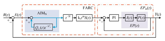 The schematic diagram of TRC is shown in Figure 2. It should be noted that, E(z) is the input of TRC, U(z) is the output of TRC, Q(z) is the internal model controller in the traditional internal model element (TIM), z−N is the internal model delay, kr is the RC gain, zm is the phase compensator, S(z) is the high-frequency filter.