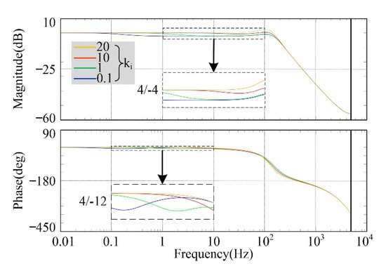 It is worth mentioning that the amplitude gains and phase of EPm(z) are slightly less than zero in low-frequency bands. In order to eliminate the offset in low-frequency band, the bode diagrams of EPm(z) with different ki values are analyzed, as shown in Figure 7. It is worth mentioning that the kp value is set to 0.08.