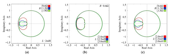 (a) Nyquist diagrams of H(z) with different R; (b) Nyquist diagrams of H(z) with different L; (c) Nyquist diagrams of H(z) with different R and L.