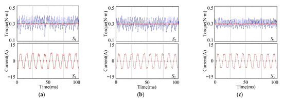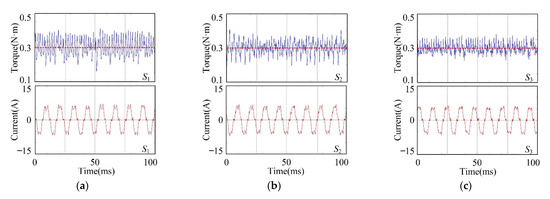 The steady-state performances of S1, S2 and S3 are compared under the same operating conditions. Firstly, the BLDC motor is operated under condition 1: the reference speed is 1500 rpm and the reference torque is 0.3 N·m. The waveforms of torque and phase A current of S1, S2 and S3 are shown in Figure 13.