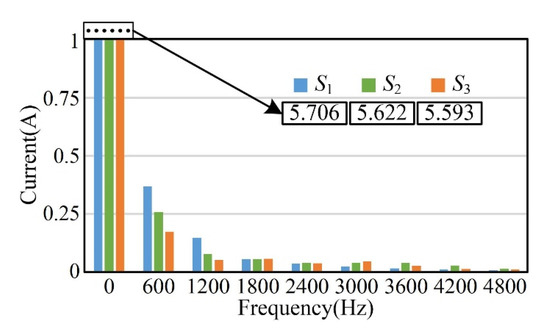 When the reference speed is set to 1500 rpm, the fundamental frequency is 1500 × 4/60 = 100 Hz. Figure 14 shows the comparison of the equivalent current spectrum at 6 k harmonics. It is worth mentioning that, when the frequency = 0 Hz, the current amplitude of S1, S2 and S3 is 5.706 N·m, 5.622 N·m and 5.593 N·m, respectively. The total harmonic distortion (all harmonics) of S1, S2 and S3 is 13.54%, 10.12% and 9.02%, respectively. Thus, the TRC can suppress the torque ripple by at least 25% in comparison with the PIC. Additionally, the FARC can suppress the torque ripple by at least 33% in comparison with the PIC. Hence, the current harmonics can be eliminated by the proposed FARC effectively.