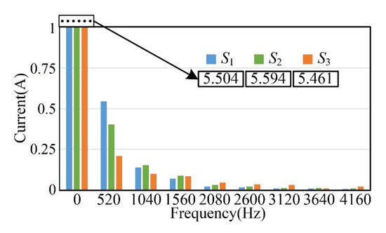 When set to 1300 rpm, the fundamental frequency is 1300 × 4/60 = 86.667 Hz. Figure 16 shows the comparison of the equivalent current spectrum at 6 k harmonics. The total harmonic distortion (all harmonics) of S1, S2 and S3 is 16.8%, 13.24% and 9.59%, respectively. Thus, the TRC and FARC can suppress the torque ripple by at least 21% and 42%, respectively, in comparison with the PIC. Therefore, the FARC shows superiority over the PIC and the TRC in reducing the torque ripples and current harmonics.