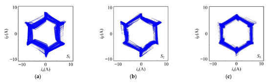 (a) Current vector trajectory diagram of S1; (b) Current vector trajectory diagram of S2; (c) Current vector trajectory diagram of S3.