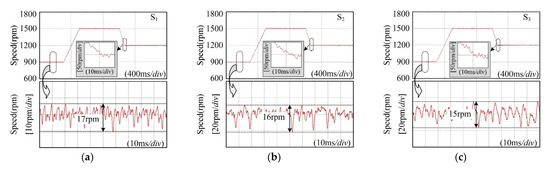 To evaluate the dynamic performance of the proposed composite controller, acceleration and deceleration simulations were carried out on S1, S2 and S3. Firstly, the BLDC motor torque is set to 0.3 N·m, and the reference speed is set to 900 rpm. Then the reference speed is increased to 1500 rpm within 0.2 s. Finally, the reference speed is reduced to 1200 rpm within 0.067 s. The simulation results are shown in Figure 18.