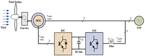 The demand for renewable energy is rapidly increasing as a result of the depletion of conventional energy sources, industrial expansion and huge human consumption of electrical power [1]. Accordingly, a particular focus is given to other inexhaustible and environment-friendly sources, in particular solar and wind energy generators [2]. Wind energy conversion systems have gained an undoubtedly distinguished place that will always be recognized in the history of renewable energies because wind energy is much more extensively available than other energy sources and is an essential mean of obtaining clean and cheap energy [3]. Wind turbines based on different wind generators can be distinguished into two main types: fixed-speed WTs and variable-speed WTs. The latter are more attractive than the former for the reason that the WT’s mechanical speed varies according to the fluctuation of the wind velocity, which allows maximum power extraction [2,4]. Among all existing variable-speed WT topologies, the DFIG is a widely used wind power generator [3]. Compared to the existing alternative technological solutions, DFIGs have a reduced power electronics rating, variable-speed operation capability, which leads to a maximum power extraction from the wind as well as a reduction in power losses [4]. Additionally, the DFIG stator is directly connected to the grid while a frequency converter (B2B converter) interfaces between the rotor and utility grid, permitting a decoupled control of the stator power and a reduced B2B converter size and making only 30% of the generator power flow through the power converters, which further reduces the cost and power losses [5].