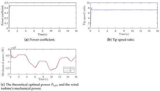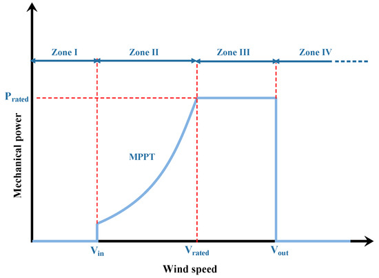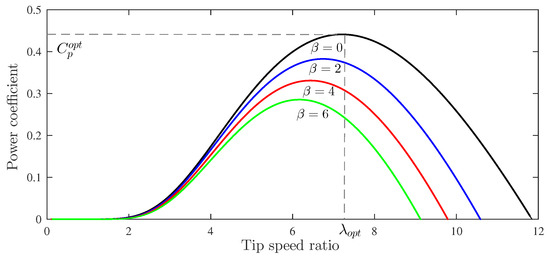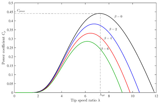 Under varying wind speeds, the WT can operate in four different regions as shown by Figure 5. In this work, only the MPPT zone was considered (zone II). In this zone, the pitch angle is maintained constant where the WECS controller implements the MPPT algorithm to extract the maximum available power [37]. Indeed, the MPPT mode is achieved only by adjusting the rotational speed of the generator and consequently the turbine rotational speed. The pitch angle is specifically used to limit the extracted power for a high wind speed (Zone III in Figure 5) or stop the turbine for dangerous and harmful wind speeds (zone IV in Figure 5). Figure 6 illustrates the power coefficient variations as a function of the tip speed ratio and the pitch angle of the WT presented in Table 2. This figure shows that for the power coefficient achieves its maximum value, which means capturing the peak power from the available wind power [38]. Thus, the pitch angle was considered to be . This fact implied that the power coefficient only depended on the tip speed ratio [39]. Under these considerations, a simplified expression of the power coefficient is: