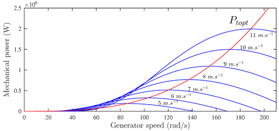 The mechanical power captured by the wind energy conversion system versus the generator speed for different values of the wind speed is illustrated in Figure 7. This figure shows that for each value of wind speed, there is a particular value of rotational velocity for which the mechanical power generated by the WT is maximum. To put it differently, the optimal operation of a DFIG corresponds to a special value of the tip speed ratio . To force the DFIG to operate at its optimal conditions, an appropriate MPPT algorithm must be used. It consists of regulating the WT rotational speed in a way that the tip speed ratio is maintained at its optimal value . In order to do so, the optimal reference speed is elaborated according to Figure 7. A graphical search of the intersection points between the curves of the optimal power and is conducted and the points are interpolated to construct a fourth-order polynomial function, which represents the generator reference speed [40]: