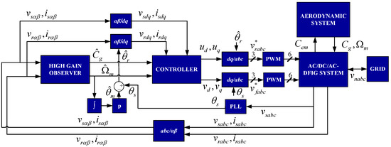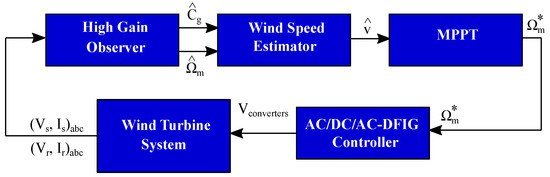 To extract the maximum available power, an MPPT algorithm is required. This algorithm requires the measurement, in real time, of the wind speed and mechanical variables of the DFIG generator using sensors that can be expensive and can make the overall control system fragile. To overcome these problems, a high-gain observer and an estimator were jointly used (Figure 4).