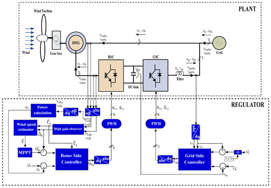 The limitations imposed by the need for mechanical variables sensors, e.g., wind speed, rotor position, generator speed and mechanical torque, in controller designs and MPPT strategies are the main drawbacks of the aforementioned methods, as long as one seeks to eliminate these sensors in electric drive systems, since they increase the maintenance costs and reduce the system reliability. Therefore, it is desirable to design a controller that is unrelated to physical sensors. The presence of mechanical observers for the mechanical variables would be useful since they can be used as an alternative solution to mechanical sensors to improve the reliability of the system and detect sensor failures. Several works have been devoted to nonlinear control strategies involving observers for mechanical variables and for different classes of plant-state models. The studies conducted in these works showed that the sensorless techniques demonstrated a superiority in terms of their tracking performance, handling disturbances and insensitivity against the lumped uncertainties. In [27], an extended Luenberger observer in a variable-speed stand-alone DFIG system application was proposed. The estimator involved two interconnected observers. The first one was a classical Luenberger observer used to estimate the stator flux and the second one was an adaptive Luenberger observer to deliver the needed rotor position desired to the stator flux estimation. The output feedback control of a DFIG machine based on a fictitious ohmic quantity observer was reported in [28]. This observer was developed to provide an online estimation of the rotor speed without using the stator and rotor resistance to improve the reliability and reduce the costs of the proposed controller. In [29], a classical adaptive backstepping observer to estimate the generator speed and the rotor position for a DFIG was proposed. A sensorless controller, a type of stator FOC, was applied to directly control the active and reactive power. In [30], a high-order sliding-mode output feedback control for a DFIG-WECS-based mechanical torque observer was proposed for the regulation of the power produced by the generator. A high-order sliding-mode observer and a high-order sliding-mode controller for the mechanical torque were separately discussed. A sensorless nonlinear controller based on a high-gain observer to estimate the mechanical torque was discussed in [31] and the validity of the observer design was demonstrated. In [32], the authors used a high-gain observer for a permanent magnet synchronous generator (PMSG) connected to the electrical grid to estimate the mechanical variables. Other works proposed high-gain observers to estimate the stator flux and the rotor speed for induction machine applications [33,34]. In [35], a high-gain observer application for a DFIG was proposed to provide the developed controller with online estimation of the mechanical variables. The proposed observer was designed based on the generator model represented in the stationary reference frame. However, the dq transformation of the used model was actually performed on the basis of the rotor position, which made it necessary to employ the rotor position sensor, thus reducing the reliability of the entire variable-speed WT. In addition, the DC-link voltage regulation, the grid-side reactive power control and the influence of the grid-side converter (GSC) on the overall control system were not included to illustrate the overall power transfer on both sides; the DFIG stator connected directly to the grid and the rotor connected to the B2B converter and then the grid.