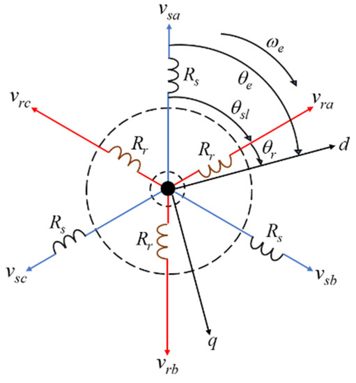 The space vector method presented in Figure 1 describes the mathematical modeling of the IM. Based on the vector method, s and r are stator and rotor circuits, respectively, and e refers to the synchronously rotating frame, while a, b and c are the axes of the phase system and d and q are direct and quadrature axes with respect to the stator components, respectively. The field angle θe is extracted from the time integral of the angular frequency ωe. By subtracting the slip frequency ωsl from the field angle, the rotor flux position θr can be calculated as: