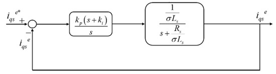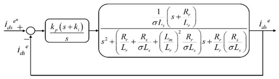 It was important to ensure that the rotor flux remained constant so that a linear structure could be achieved. The inner loop of the plant system needed to be considered to fulfill the closed-loop transfer function. Therefore, the block diagram in Figure 5 was obtained after several calculations based on the IM circuit analysis with respect to the d–axis of the current controller.