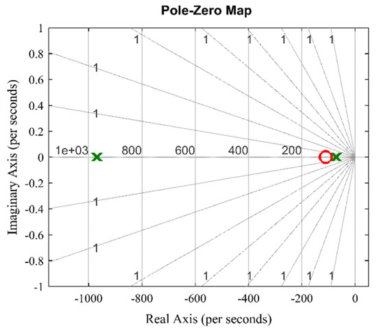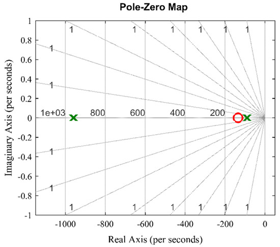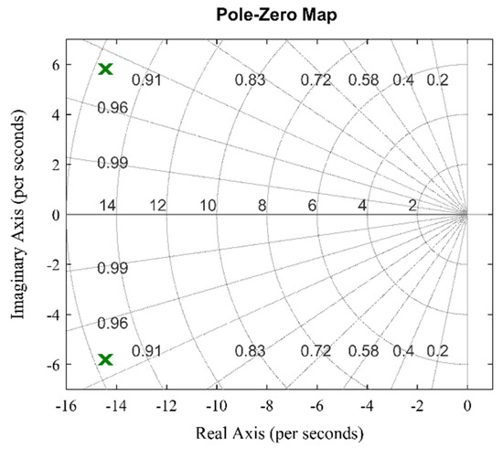 Based on the second-order closed-loop transfer function above, the stability of the system can be analyzed by solving the poles of the transfer function. It consists of two poles, labeled as “X”, which are −14.3891 + 5.4485i and −14.3891 − 5.4485i, with a negative real part and no positive pole, as shown in Figure 10.
