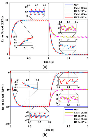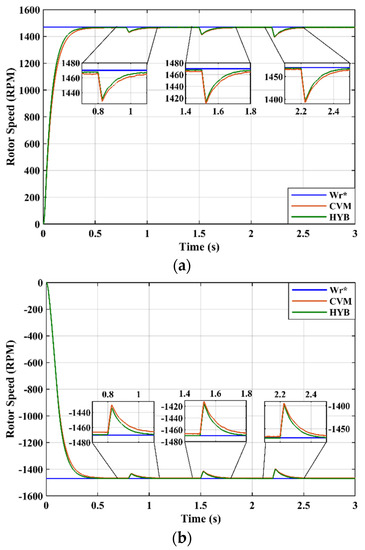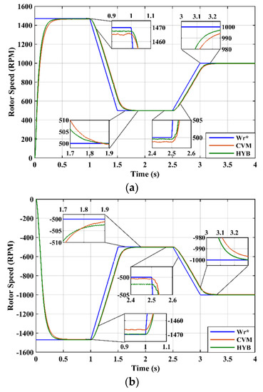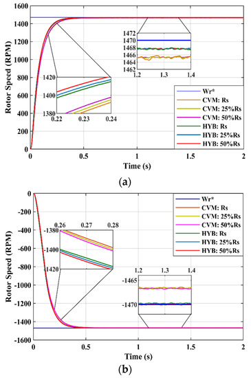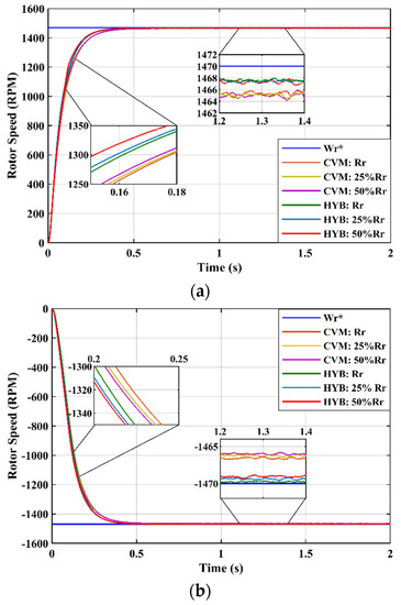 The block diagram of the estimator, depicted in Figure 4, consists of the stator flux control obtained from the rotor position by compensating the back-EMF error. Since rotor position is related to speed, which is affected by rotor time constant, it depends on rotor resistance, which varies according to temperature during the operation. To test the drive performance of the stator flux control in the suggested hybrid estimator, rotor resistance was varied by 50% of the nominal value with an increment of 25%. Figure 11a,b show the effect of rotor resistance variation on the rotor speed of two different estimators in two different modes. Both HYB and CVM estimators showed consistent performance in forward and reverse operations, with the results obtained confirming the estimator’s functions. The speed characteristics of the two estimators are summarized in Table 1. The two estimators without parameter uncertainty produced similar performances. However, compared with these two estimators, the conventional voltage model, which is not discussed here, took a longer time to track the reference rotor speed (blue line). When the hybrid estimator was applied, there was a shorter tracking time, but it was not remarkable.