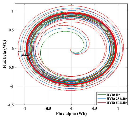 Based on the rotor speed obtained for the proposed hybrid sensorless estimator, the stability response of the rotor flux against rotor resistance variation is shown in forward operation in Figure 12. As can be observed, the rotor flux response consisted of a few overshoots at the beginning due to the variation of 25% Rr and 50% Rr. However, the value was in an acceptable range of <20% overshoot with a 0.46 damping ratio. This confirms that the proposed hybrid estimation possesses a good dynamic response against parameter variation during its operation.