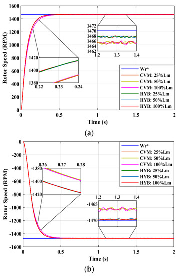 When involving temperature, the mutual inductance parameter was also taken into account in this study case. The values of stator and rotor inductance parameters in this research were the same. The variation in inductance also affect the mutual inductance of the IM. Several studies on inductance against temperature have been conducted, such as in [25], which concluded that inductance remains functional in a high temperature and there is no temperature dependence. However, [26] stated that a 1% change in resistance produced by 2.54 °C corresponds to a 0.0076% increase in inductance. In this research, mutual inductance was varied by 25% and 50% of the nominal value. This means that the temperature was very high during motor operation. As shown in Figure 14a,b, the effect of mutual inductance gave almost the same speed response in both forward and reverse operations either for the CVM or the HYB. Referring to Table 4, the HYB estimator could improve the dynamic performance of the IM compared with the CVM, as the average speed error was below 0.16%. This proves that the proposed estimator works effectively against parameter variation.