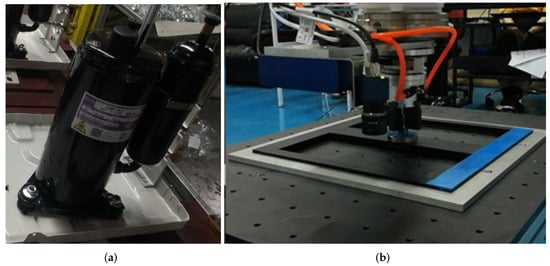 Two automated assembly procedures with a robotic arm are depicted in Figure 1. An air compressor assembly in an outside air conditioning production line is depicted in Figure 1a Four pre-drilled screw holes in the air compressor should be passed vertically through the stud on the base plate to finish the assembly. Figure 1b depicts a rectangular workpiece assembly that must be inserted into a slot.
