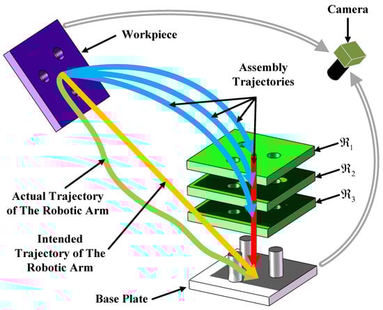 A more intuitive geometric model was constructed to better illustrate the spatial constraint in IBVS, as shown in Figure 2. There is a purple workpiece with three through holes and a base plate with three columns. The holes have the same spatial relationship as the columns, allowing the workpiece to be securely connected to the base plate. Additionally, , , and are three assembly nodes, each with its own individual curve. The yellow curve depicts the intended trajectory of the robotic arm. In contrast, the green curve indicates the actual trajectory of the robotic arm. While the yellow curve is the most energy-efficient path between the workpiece and the base plate, it does not meet the spatial constraint. In comparison, the red-blue trajectories, while longer, are consistent with our expectations for this assembly task. The spatial constraint could be repeated. When a workpiece reaches the assembly nodes confidently, it must be moved closer to the base plate in a perpendicular direction to complete the assembly task.