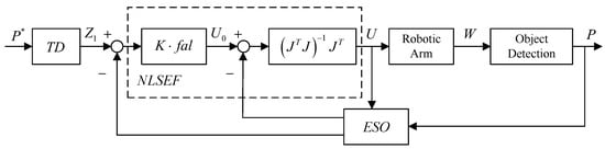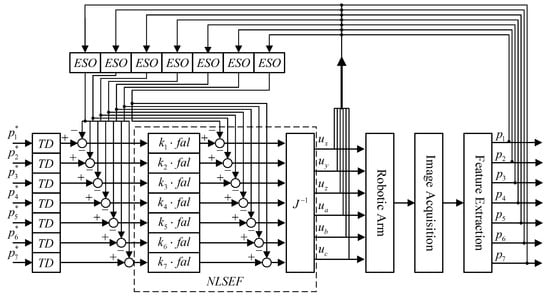 The active disturbance rejection controller (ADRC) is a non-linear uncertain system control method based on the traditional proportional-integral-differential (PID) control method and modern control theory []. An ADRC should be consists of a tracking differentiator(TD), a control law of non-linear state error feedback (NLSEF), and an extended state observer(ESO). The earliest application of ADRC to visual servoing technology was by Jianbo Su []. The main idea of ADRC in an IBVS system is to first create a linear system model with a constant Jacobi matrix and then use the ESO and NLSEF to estimate and dynamically compensate for non-linear model and positional errors []. Figure 4 shows the schematic of an ADRC-based visual servoing system.