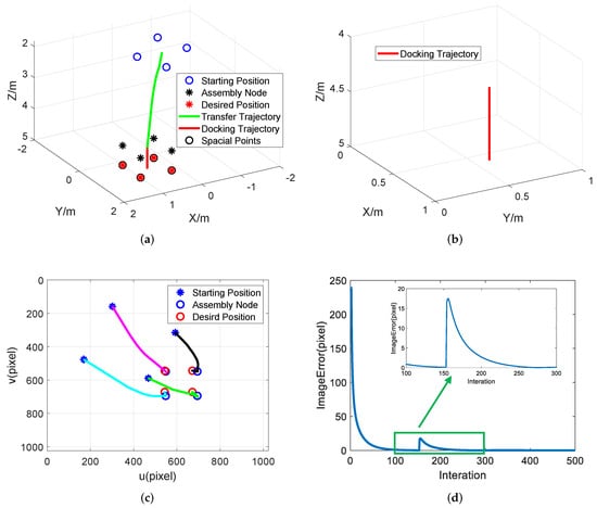 The First Simulation Result by The Proposed Method: (a) Complete Spatial trajectory of the robotic arm. (b) Docking trajectory. (c) Image trajectory. (d) Position error in the image.