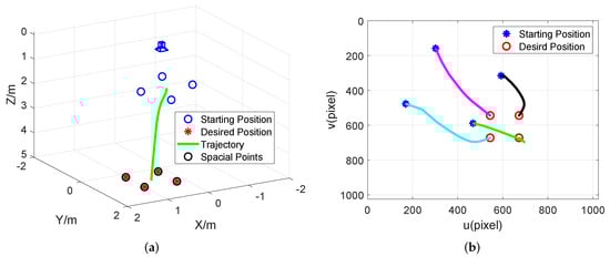 The constraints, which refer to the limitations imposed on the motion of the robotic arm by the camera’s FOV and equipment requirements, are issues to consider when designing a visual servoing controller. Two widely used techniques for incorporating constraints into controllers are model predictive control (MPC) and trajectory planning [,]. The MPC is primarily used in the field of industry. Its premise is to solve an online finite horizon open-loop-constrained optimization problem by combining acquired image information with system constraints []. The resulting sequence is then considered the system control signals. An MPC method based on the discrete-time visual servoing model was published in [,,,] to obtain the convergence of robot motion by non-linear constraint optimization. The MPC method allows the robotic arm to move closer to a straight line, keeping the end-effector in the camera’s field of view and preventing the controller from generating signals that violate physical constraints []. Moreover, the control signal produced by the MPC controller cannot cause robotic joint limits to be exceeded []. However, in the presence of obstacles, the controller based on MPC cannot actively modify the trajectory, implying that the robotic arm cannot be driven to follow a non-linear trajectory.