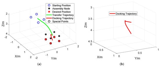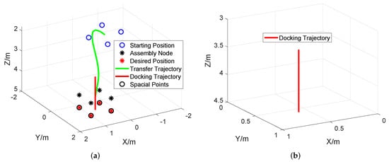 The third simulation was performed to ensure that the method used in Section 3.4 is valid. When the workpiece reaches the assembly node, and are replaced with unit matrixes of the same size, and the docking trajectory is planned using the conventional method based on ADRC, as illustrated in Figure 8. Despite the small distance between the assembly node and the destination position, the conventional controller has difficulty driving the robotic arm in a straight trajectory, as demonstrated in Figure 6 and Figure 8. The assembly task cannot be completed in this situation, even though the workpiece has been transported into the assembly node.