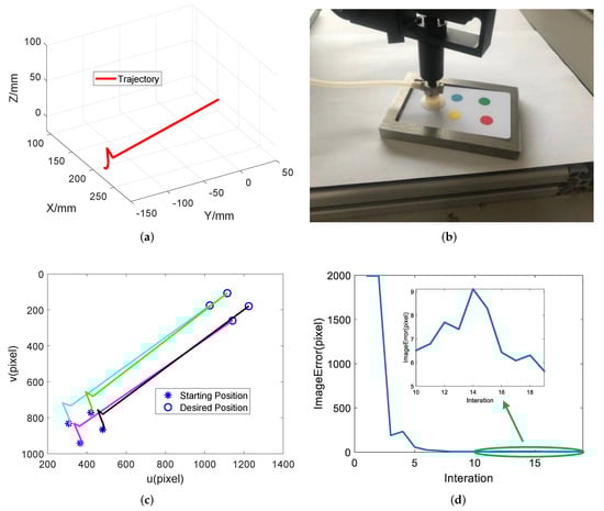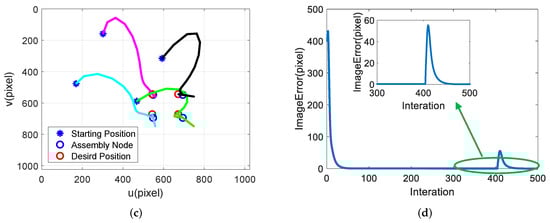 In the first simulation, the efficiency of the proposed visual servoing control method based on perspective transformation was evaluated, and the results are shown in Figure 6. The spatial trajectory of the robotic arm is smooth, with no cases of camera retreat. The position error drops dramatically within the first 100 iterations, reaching a threshold of 0.05 pixels by the 158th iteration. As illustrated in the simulation results, the control method proposed in this research accomplishes the desired goal of delivering the workpiece to the assembly node in an attitude.
